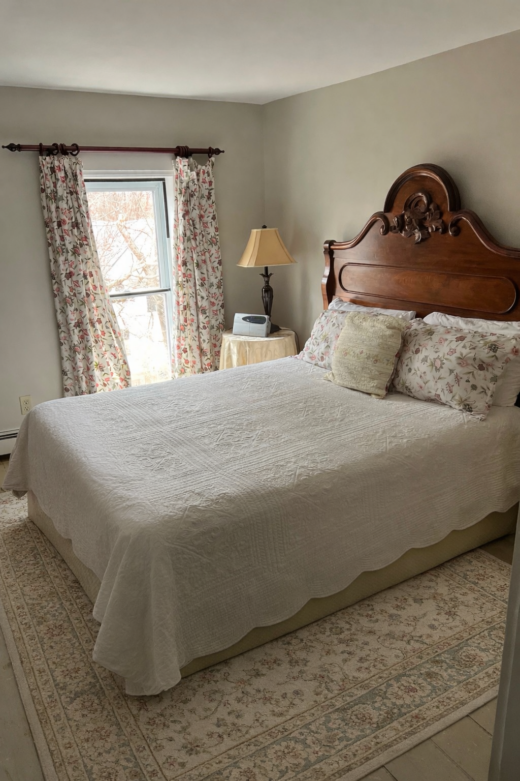 Located on the 3rd floor, this is a very cozy room decorated in floral prints. Gabled windows provide a bright space with a small sitting area. This room has a queen size Shaker bed and an ensuite 4 pc bath with claw foot Victorian soaker tub. It is air conditioned and has a TV, telephone and CD clock radio.