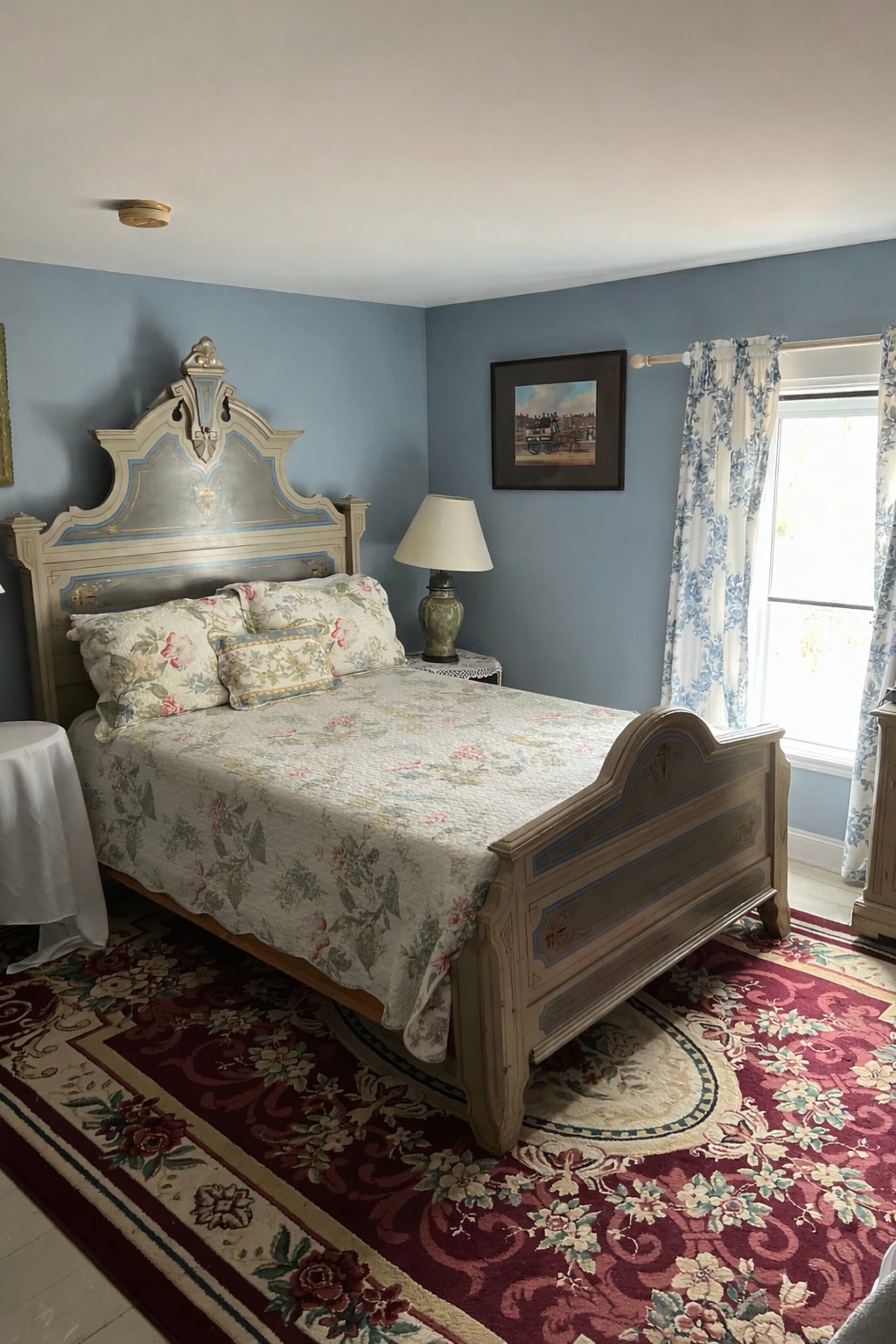 This room is located on the 3rd floor. It has both a double and a single bed, so can comfortably accommodate up to 3 guests. There is a large ensuite 4 pc bath with claw foot Victorian soaker tub. Decorated in shades of blue, the room is completed with hand painted antique furniture from the Victorian era. The room is air conditioned and has a flat panel TV, telephone and CD clock radio.