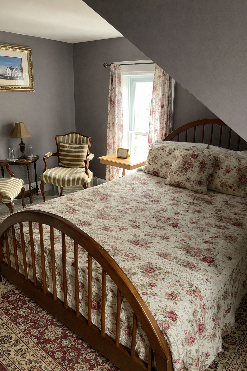Located on the 3rd floor, this is a very cozy room decorated in floral prints. Gabled windows provide a bright space with a small sitting area. This room has a queen size Shaker bed and an ensuite 4 pc bath with claw foot Victorian soaker tub. It is air conditioned and has a TV, telephone and CD clock radio.